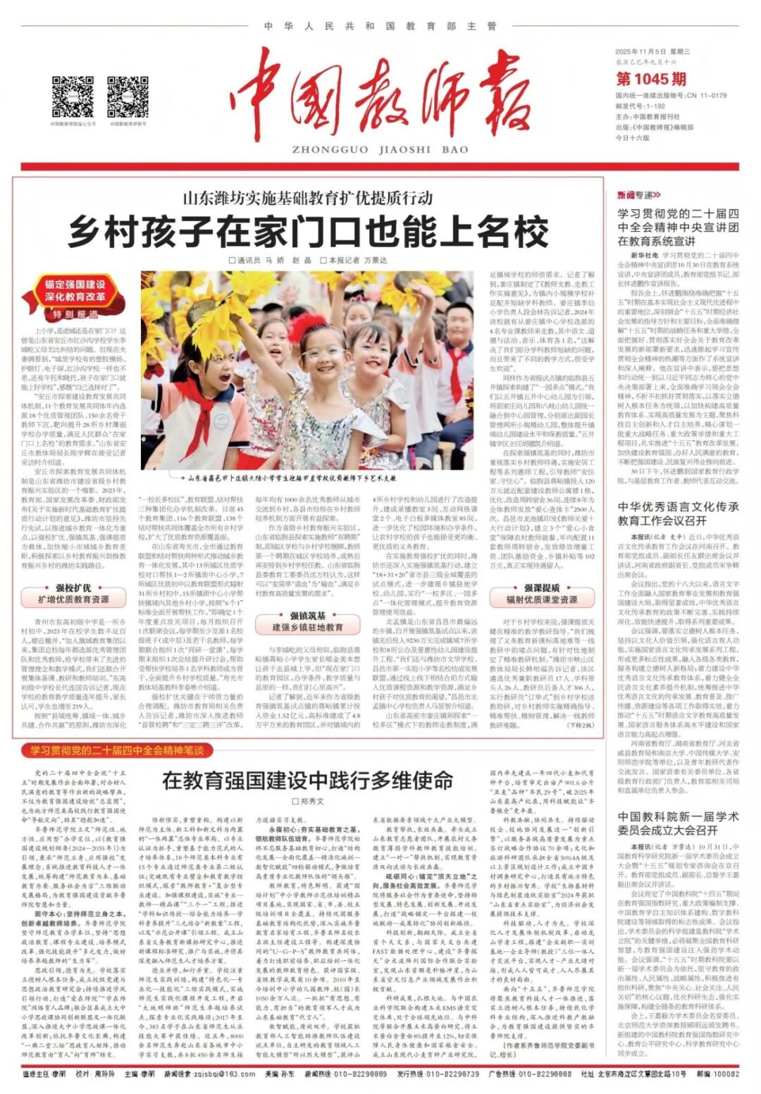 11月5日 ,《中國教師報》頭版頭條聚焦濰坊教育,以《山東濰坊實施基礎(chǔ)教育擴(kuò)優(yōu)提質(zhì)行動 鄉(xiāng)村孩子在家門口也能上名?!窞轭},推介濰坊實施基礎(chǔ)教育擴(kuò)優(yōu)提質(zhì)行動的典型做法。